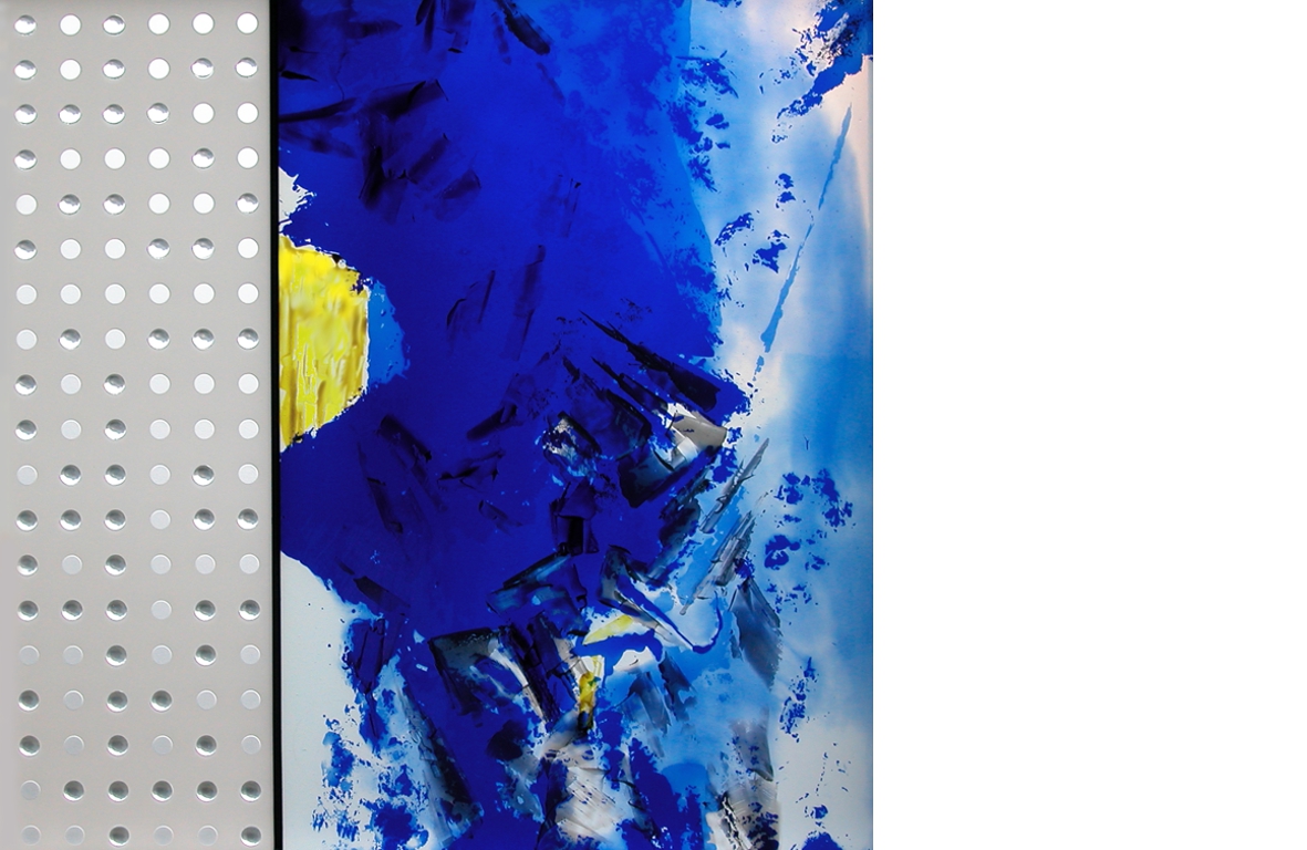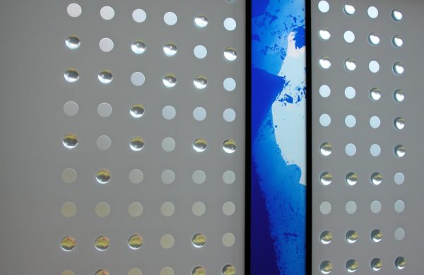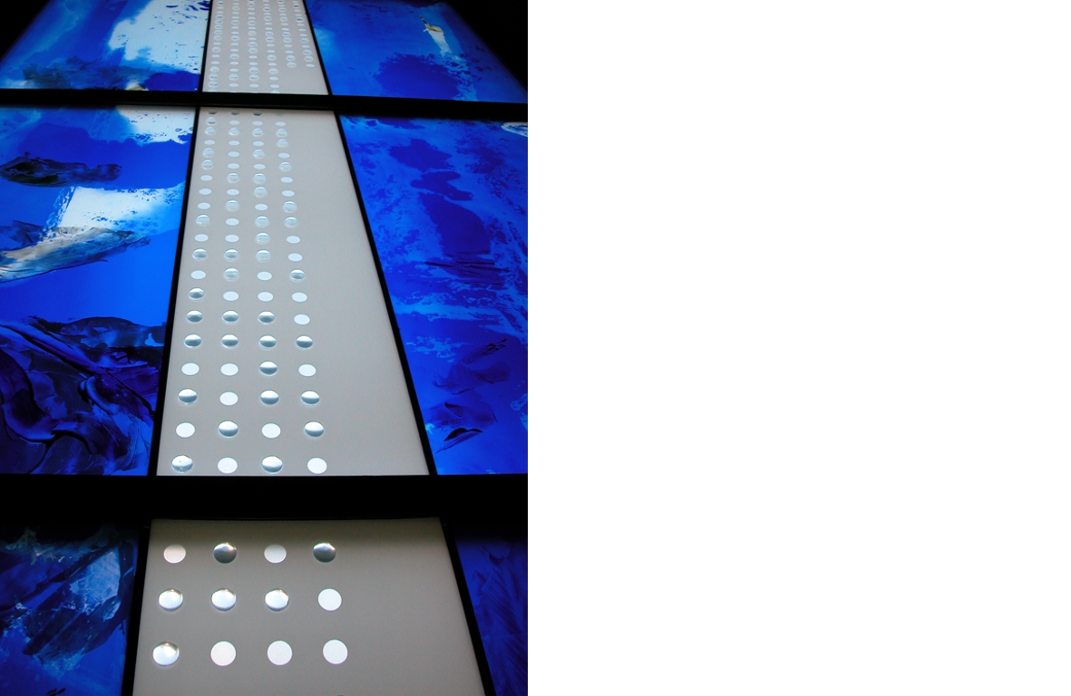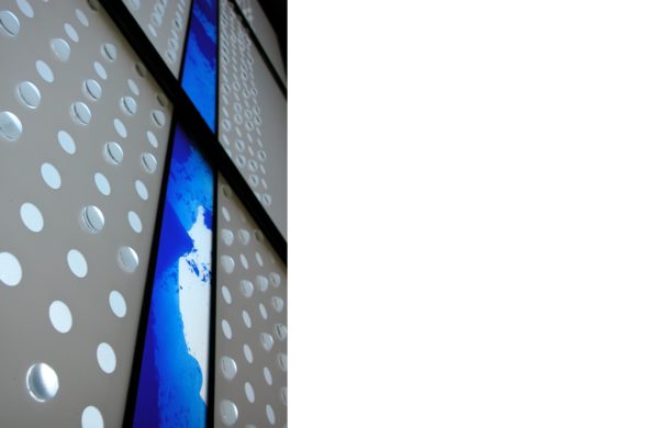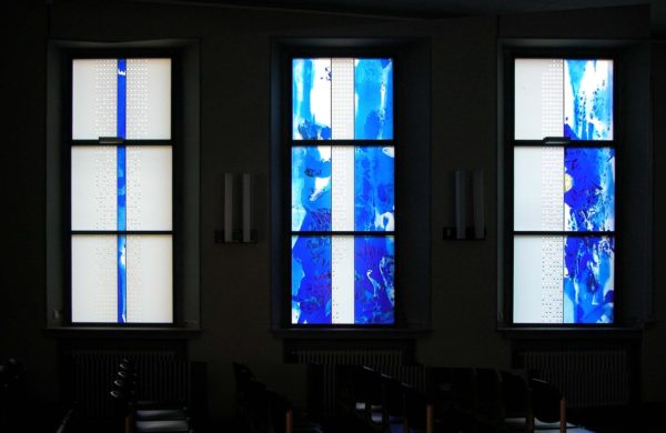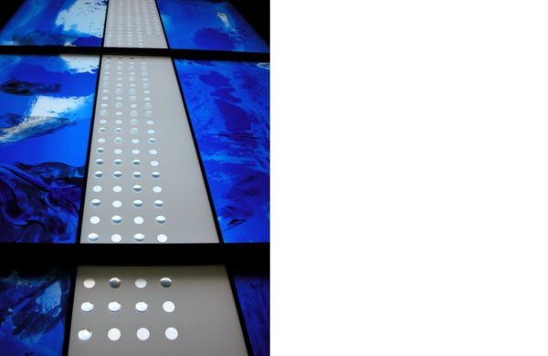 Glasgestaltung: Echt-Antikglas mit Malerei und Ätzung, Milchüberfanglas mit Glaslinsen, 18qm